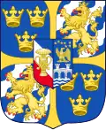 Écartelé à la croix pattée d'or, qui est la Croix de Saint-Eric, cantonnée en 1 et 4, d'azur à trois couronnes d'or posées 2 et 1 qui est de Suède moderne, en 2 et 3, d'azur, à trois barres ondées d'argent, au lion couronné d'or armé et lampassé de gueules, brochant sur le tout, qui est de Suède ancien, sur le tout, tranché d'azur et de gueules à la banche d'argent et à la gerbe d'or brochant sur le tout qui est de Vasa.[8][9] in English