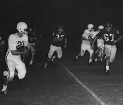 Hal Lahar was announced as Houston's next head coach on January 18, 1957.[17] Lahar came from Colgate University, where he had served as head coach for five seasons.[18] In college, Lahar had played for the Oklahoma Sooners, where he was a part of the school's first bowl team.[19] Under Lahar, during the 1958 season, the Cougars became a nationally recognized offensive leader, as the team scored a combined 117 points in their first three games. Lahar's offensive strategy was best characterized as Split-T.[20] After winning the Missouri Valley Conference titles again in 1957 and 1959, Lahar left UH in 1961 and headed back to Colgate University.[19]