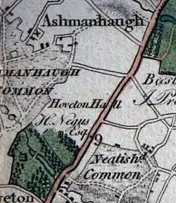 The exact site of the previous manor house, also called Hoveton Hall, demolished when the new house was built in 1809, is unknown as no part of it survives. However Basil Cozens-Hardy concluded, having analysed old maps and data: "it would seem that the original Hall was near the kitchen garden in the park, as a map and schedule of about 1840 (see map below) calls the field to the south-west "the Old Hall Close” (a "close" being an old term for an enclosed field). Moreover in Faden’s map of 1797 (see image) the Hall is shown at this point with an avenue running down to the road."[4]