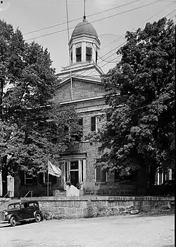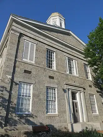 Construction of the granite building, designed by Charles Timanus, cost $24,000 and took three years (1840–1843). It is situated on a steep hill once named Capitoline Hill on property purchased from Deborah Disney.[2] It also went by the nickname "Mt. Misery", most likely due to the pain of hauling granite blocks up the steep hill.[3] In 1972, local historian Charles Stein claimed that the heavy granite block construction "should continue in service for centuries".