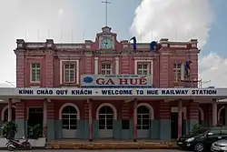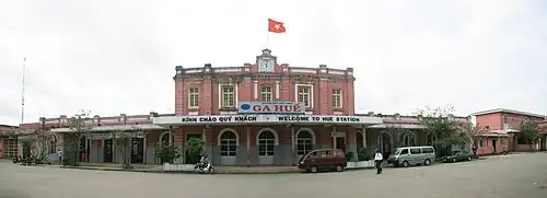 The station was built by the French colonial authorities during the French Indochina period. The station is influenced by French architecture and is today considered one of the most beautiful railway stations in Vietnam.[2] Built by the French Public Works Department, it was considered a "rectangular horror" according to a source from 1913.[3] During the Vietnam War in the Battle of Hue the station housed snipers but U.S. troops drove them out.