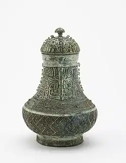The hu is a pear-shaped vessel that has been found in both a round and square form.[16] Examples have been discovered with a variety of decorative motifs. During the Shang dynasty one hu would typically be offered, decorated with relatively simple taotie designs. Dragons, cattle and thunder patterns also appear on hu vessels during the Shang dynasty. During the Zhou dynasty the style of the vessel changed, with taotie being replaced by "heavy, rounded relief figures on a plain ground". Though, one example from the Late Zhou period shows the entire vessel covered with images that correspond with everyday life. Silk worm farming, hunting, archery, and warfare are all represented.[17] Interlacing dragon motifs were also popular during the Zhou period,[18] as were "wave" designs.[19] By the late Spring and Autumn period the decoration of the vessels in some regions had changed to reflect the influence of animal style art from Central Asian nomads. Hu of this type often used designs that were geometric versions of earlier Taotie motifs and employed copper inlay. During the Warring States period the shape of the vessel was occasionally modified, taking on a more squared appearance. This squared version of a hu is referred to as a fāng hú. Another variation was the yu, which added a single handle arching above the lid of the vessel.