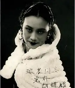 Hu Die was born Hu Ruihua (Chinese: 胡瑞华; Wade–Giles: Hu Jui-hua) in Shanghai in 1907[1] or 1908,[2][3] and moved to Guangzhou (Canton) when she was nine. Her father then became the general inspector of the Beijing–Fengtian Railway.[2] She spent much of her adolescence in northern cities including Beijing, Tianjin and Yingkou, and learned to speak perfect Mandarin, which later proved to be a great advantage when the cinema of China transitioned from silent films to talkies.[1]