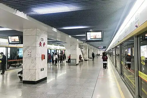 Huangsha station (simplified Chinese: 黄沙站; traditional Chinese: 黃沙站; Jyutping: wong2 saa1 zaam6; Cantonese Yale: Wóngsā Jaahm; lit. 'Yellow Sands station') is an interchange station between Line 1 and Line 6 of the Guangzhou Metro, and was the first Line 1 station to have platform screen doors installed. Line 1 started operations on 28 June 1997. Line 6 started operations on 28 December 2013. It was the terminus of Line 1 when the Guangzhou Metro started the service in 1997. It is situated under the junction of Datong Road (Chinese: 大同路) and Liu'ersan Road (六二三路) in the Liwan District of Guangzhou. It is near Shamian Island, where the White Swan Hotel and many Western style buildings are.[1][2] It became an interchange station between Line 1 and Line 6 in 2013.[3]