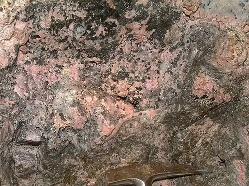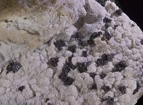The Huarón Mining District is one of the richest polymetallic (Zn-Pb-Ag-Cu-(Au)) deposit clusters in Peru. It is located 20 km SSW of Cerro de Pasco, in the Huayllay District, Pasco Province, Pasco Department, between 4500 and 4700 m.a.s.l. The Huarón Mining District belongs to the Miocene polymetallic belt of the Central Andes.[1][2] Hydrothermal mineralization occurs as predominantly in N-S to NNW-SSW and E-W veins as well as in "mantos" replacing favorable sedimentary rock. Epithermal hydrothermal fluids are thought to be derived from quartz-monzonitic intrusions tentatively dated at 7.4 Ma (K-Ar on adularia).[3] The most important economic minerals are tennantitetetrahedrite (containing most of the silver), sphalerite, galena, and chalcopyrite. Silver is also found in pyrargyrite, proustite, polybasite, and pearceite. In the central copper core of the Huarón deposit, enargite occurs.[4] Main gangue minerals are pyrite, quartz, rhodochrosite, and calcite.[4]