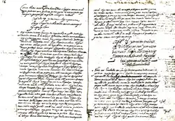 The Huarochirí manuscript is the only surviving written source that records a prehispanic religious tradition of the Andes in an Andean language. As it was recorded decades after the entry of European colonists into the region, the retellings of these religious traditions were influenced by the preceding seventy years of colonial turbulence, including forced conversion and persecution.[2] The manuscript was recorded and annotated by the Cuzco-born cleric Francisco de Ávila, who was responsible for the eradication of pagan beliefs – it is therefore considered ironic that the manuscript now preserves these very beliefs.[1] The manuscript serves as a complex composite of testimonies and social memories, and the exact process of composition is unknown.[2] It also contains many crossing-outs, tangents and marginal queries, likely those of Francisco de Ávila. It has been argued by Jorge Sanchez-Perez, Assistant Professor of Philosophy at the University of Alberta, that de Ávila's purpose was to use the myths recorded to prove the supposed superiority of the Christian faith, and to profess that he had been given foresight of these beliefs when attempting the conversion of indigenous peoples.[3] The work of Huarochirí specialist Sarah Bennison of the University of St Andrews argues that both the colonial Huarochirí Manuscript and the twentieth-century Entablo Manuscript are intimately tied to khipu ('quipu') accountancy.