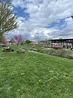 The park contains a picnic pavilion, playground equipment, and gardens.[1] It is named in honor of former Public Safety director Gordon Hufnagle, who died saving lives during the Agnes Flood on June 21, 1972.[2] A covered footbridge just north of the park was built in his honor in 1982.[3]