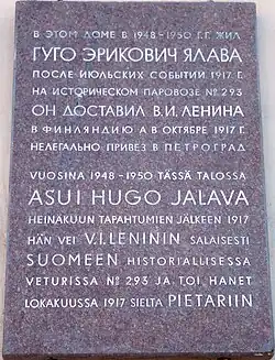 - In 1970, a memorial plaque made of pink granite with Russian and Finnish text was placed on the house at Lenin Street 13 in Petrozavodsk. The inscription on the plaque roughly reads: "In this house lived Hugo Erikovich Jalava from 1948 to 1950. Following the events of July 1917, he brought V. I. Lenin to Finland with the historic locomotive No. 293 and brought him illegally to Petrograd in October 1917."[6]