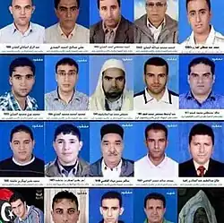 A prisoner protest then took place because of these harsh conditions and food was distributed among the prisoners by other prisoners. The guards then opened fire, killing six prisoners and wounding 20. Government negotiators, including Abdullah Senussi, then met with prisoner representatives who asked for improved conditions, care for the sick and trials to be made in order to prove the innocence of these wrongfully convicted prisoners. Senussi did not accept to put prisoners on trial, but he agreed to the other conditions, once the captured guard was released.[39] The prisoners agreed. Hundreds of injured and sick prisoners were told they would receive medical care and were taken away in buses. They were never seen again and their whereabouts are unknown to the present day.[40]