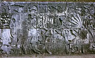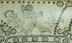Sacrifice by decapitation is depicted in Classic period Maya art, and sometimes took place after the victim was tortured, being variously beaten, scalped, burnt or disembowelled.[3] Sacrifice by decapitation is depicted on reliefs at Chichen Itza in two of the ballcourts (the Great Ballcourt and the Monjas Ballcourt).[4] The Hero Twins myth recounted in the Popol Vuh relates how one of each pair of twins (the Hero Twins themselves and their father and uncle) was decapitated by their ballgame opponents.[5]