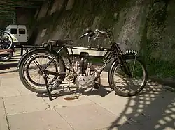 On 10 July 1899 Bert Yates won a motorcycle race on his Humber motorcycle in Coventry in what he claimed was the first motorcycle race ever held on a track.[2] This was in spite of problems with the ignition lamp going out (hot tube ignition). The engine was mounted on the right hand side of the rear wheel, with the crankshaft passing through the wheel and the flywheel on the left side and drive via an epicyclic gear in the hub (unlike the Pennington patented design had cylinders both sides with the bulk of the engine behind the rear wheel driving the rear wheel spindle directly[3]). The machine in this 1899 race was later converted to electric ignition. According to Bert's account Humber sold 15 to 20 of these motorcycles. From the description and timing these would most likely be powered by De Dion-Bouton engines, as they started making their lightweight engine in 1896 - initially with hot tube ignition,[4] and Humber collaborated with Harry Lawson (of New Beeston Cycle Co) who held a licence for the De Dion-Bouton engines. New Beeston Cycle Co had exhibited a De Dion-Bouton engined motorcycle at the Leeds Motor and Cycle Show in February 1897.[5]