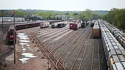 Humboldt Yard is located west of North Humboldt Avenue and south of 49th Avenue. It is part of the Payneville Subdivision of the SOO Line Railroad.[31][32] The switching yard has been in operation since at least 1938[14] and makes up the largest use of the industrial area.[11] Along with Shoreham, Humboldt Yard is one of the largest rail yards in Hennepin County. The two are owned by Canadian Pacific and responsible for six million tons of freight annually. Humboldt is primarily a switching and translating yard for plastics, forest products, and other aggregate materials.[33][34][31] The yard features 28 tracks for a capacity of 1,400 cars.[31] In 1992 and 1993, the General Electric shops at the yard rebuilt the Milwaukee Road 261 engine.[35]