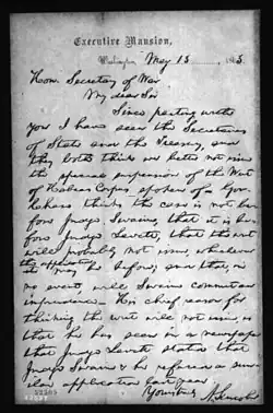 Letter from President Abraham Lincoln to United States Secretary of War Edwin M. Stanton discussing Judge Humphrey Leavitt's decision in habeas corpus case