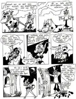 The popularity of comics streaming into the country made many ask the question: why are not there individual comic book series published? (N.B. at the time the main field of Hungarian comics were still newspapers, magazines.) The Ministry of Culture, the Office of Information and the General Directory of Publishing previously never authorized such attempts.[93] The less harsh tone of the mid- and late-eighties (see Glasnost) brought some changes in the field of comics. Some foreign comics were allowed to be published in Hungarian, not just comics from the Eastern Bloc (e.g. Mozaik) or comics from communist French publisher L'Humanité (Vaillant, Pif Gadget), but some politically 'harmless' series as Asterix and Lucky Luke (as Wilám Will) in Alfa,[94] Tom and Jerry (as Tom és Jerry since 1987),[95] Mickey Mouse (as Miki egér from 1988)[96] and Swedish Bobo and Góliát (both from 1986),[97][98] Tumak, Pink Panther, Nils Holgerson, etc. One of the most important magazines of the era was Kockás, that selected stories from Pif and its predecessor Vaillant.[99]