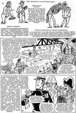 During this period the truncated Hungary was an ally of Germany. In 1937 the Minister of Justice began restricting the great amount of pulp literature and yellow press. In 1938 a decree ordered the whole press under the control of the Government. In the same year the "First Jewish Law" was issued.[28] Among others the goal of these two were to "clean" Hungary's cultural life, to eliminate pulp literature. As the Újság, a Hungarian extremist newspaper, commented in 1938: "These are not at all capable to nurture Hungarian self-knowledge, Hungarian honesty, Hungarian heroism, consequently to nurture the Hungarian folk, national and racial self-knowledge."[29] Since most of the comics were published in the mostly Jewish owned yellow press, comics vanished after the law took effect.[30] The situation became even worse after the German troops marched into Hungary: all leftist and liberal media was banned.[31] The only comics of the time were antisemitic ones, from magazines as the militant Harc (combat) or anticommunist ones from newspapers as Egyedül vagyunk (we are alone).[30][32]