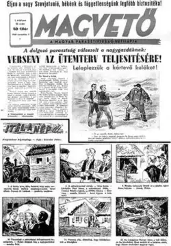In the post-war period, Hungary's cultural-politics were heavily influenced by the Soviet Union. In the first few years comics returned to the newspapers and other magazines: first humorous children comics in 1945,[37] then communist propaganda strips in 1948. The Hungarian term for comics – képregény – became widespread during this short period.[37] In 1950 – according to a famous anecdote – during a visit to Budapest, Finogenov, an influential aesthete from Moscow, called comic books an "imperialist vestige". Within a few days Hungarian prime minister, Mátyás Rákosi withdrew all the "western cultural trash" from the press.[30]