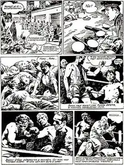 • Imre Sebők [69] (Apostag, 6 August 1906 – Budapest, 14 September 1980)[70] painter, cartoonist, graphic artist. After art schooling at Jenő Feics and Tibor Pólya, Sebők studied at the Academy of Fine Arts under the instruction of Oszkár Glatz and Aurél Bernáth, but left school after two years for financial reasons. Besides being a regular illustrator at Tolnai világlapja (Tolnai's world magazine), his illustrations were frequent at Délibáb (Mirage), Ünnep (Holiday), Párizsi Divat (Parisian Fashion), Magyar Cserkész (Hungarian Boyscout). His first "subtitled" pictorial stories were published in Gyermekvilág (Child World) in 1942. His painted covers and illustrations for magazines and pulp novels made him widely known, earning an invitation to draw Tarzan comics in Canada, but he did not accept the offer.[70] Besides Pál Korcsmáros, after 1945 he became one of Pesti Izé (Pest Whatchamacallit)'s star illustrator, with slightly erotic images. His comics (usually adaptations written by Tibor Cs. Horváth) were mostly published in Magyar Ifjúság (Hungarian Youth) (after 1958), Népszava (People's Voice) (after 1962). After 1966, exhausted by the daily strips for Népszava, his art became less detailed, sketchy. The daily rush being already behind him made it possible for the artist to reach his second peak from 1973 till his death in 1980.[71] His style is closest to Alex Raymond and Burne Hogarth with the difference that he never made a compromise in favor for better understanding and vendibility.[72] A master of anatomy, his characters' movement are perfect, the static view points are counterpointed by dramatic lighting compositions and emphasized expressive hand gestures.[72][73]