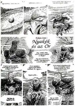 • Marcell Jankovics (Budapest, 1941–2021 )[81] animation director, cultural historian, illustrator. After finishing the Benedictine High School of Pannonhalma he wished to become an architect or archeologist, but was rejected twice due to his family background.[nb 5] He worked as an unskilled laborer, than from 1960 as an inbetweener at the Pannónia Film Studio. In 1965 he was promoted as an animation director. Sisyphus, directed by him, was nominated for the Oscar Awards in 1974, The Struggle won the Palme d'Or in the short film category in 1977 (to name two of more than forty prizes he won).[81] Between 1970 and 1971 he drew four adaptation-comics (scripted by Cs. Horváth). He described these works as a by-pass in his career, discovering that comics production requires much more work and pays less than animation – as he stated in an interview.[82] Although comics historians and critics praise his works for their art and stylistic diversity, they also agree on that the fact that he did not continue his career in this field, is a great loss to Hungarian comics.[83][84]