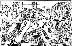 At the time comics were not published in separate comic books, but sequentially in newspapers (e.g. Népszava), magazines (e.g. Képes Újság, Pajtás), and the crossword puzzle magazine Füles. Füles later became a flagship of Hungarian comic publishing. (Füles published the most comics during the period. It was the most important publisher of Pál Korcsmáros and important publisher for artists like Ernő Zórád.)[42] In December 1956, a few weeks after the soviet tanks ended the Revolution of 1956, György Gál and some journalists started conceiving a new, entertaining weekly magazine based on previous magazines such as Pesti Izé and Füles Bagoly. The magazine based on crossword puzzles, articles and comics immediately became a large success.[43] Some say the magazine had a role in healing the wounds.[43] Between January 1957 and December 1960 11 artists drew especially comics. The sum of their work during this period was 145 comics in 2000 pages. 50% of the storyboards were written by Tibor Cs. Horváth, the other by 17 other writers. 40% of the art was done by Pál Korcsmáros (in 1957 he drew 238 pages only for Füles), 20% by Ernő Zórád and 14% by Imre Sebők.[44] Some attempts were made to create pure comic magazines. One of these was Tábortűz (1957–1965), another magazine for Pioneers, based on the French Camera 34 and full of fresh ideas. Although it did not meet the Pioneer Association's ideas and ordered the editorial to drastically reduce the number of comic pages in the magazine.[45]