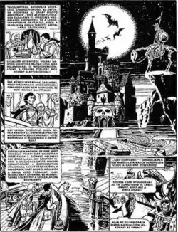 Ernő Zórád ended his professional relationship with Tibor Cs. Horváth and wrote his own comic scripts.[49] Luckily Zórád was not just a great artist, but also a talented storyteller: these comics came much closer to the medium's own language.[49] He also made experimental collage comics in the early seventies attracting international attention. These works were invited to the Salone Internazionale del Comics festival in 1970 but his portfolio – due to Hungarian bureaucracy – has arrived late. Furthermore, the works has been stolen from the festival.[37][50] By the late seventies the classic trio of Hungarian comics creators disappeared: Korcsmáros died in 1975, Sebők died in 1980 and Zórád retired temporarily. Since young talents were not introduced during the preceding three decades (except for Attila Fazekas), many mark these years the end of Hungarian comics' golden age.[37]