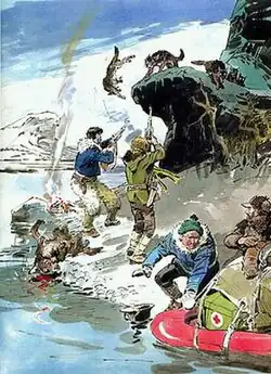 In 1954 Ernő Zórád, one of Hungary's all-time greatest comic book artists, dared to bring back comics with his adaptation of Vladimir Obruchev's Plutonia (comics' title: Az Északi-sarkról a Föld belsejébeFrom the North Pole to the Center of the Earth).[37] This was published in Pajtás, a magazine for the Pioneer movement (the communist co-ed equivalent for scouting). 1955 was a milestone in Hungarian comic book history, since this was the year when graphic illustrator Sándor Gugi convinced Tibor Horváth (Later Tibor Cs. Horváth) to create some comics together. It was also Gugi's idea to produce comics that adapt classic literature.[37] No one could call adaptations of famous and recognized literary works "decadent western trash", so comics received a green light at the time. Gugi presumably got the idea of adaptational comics from Classics Illustrated.[40] Adaptational comics, what started out as a trick, became dominant for decades. Sándor Gugi left the field relatively early, but Tibor Cs. Horváth produced a vast of comics scripts for some very talented artists such as Imre Sebők, Pál Korcsmáros and Ernő Zórád. These three had their own easily recognizable style and are considered the greatest comic artists of Hungary.[37][41]