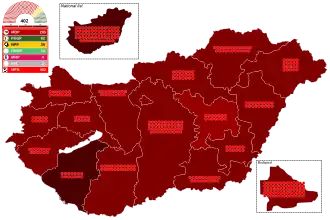 Parliamentary elections were held in Hungary on 15 May 1949.[1] The Hungarian Independent People's Front, an umbrella group created that February to replace the National Independence Front and led by the Hungarian Working People's Party (as the Hungarian Communist Party had been renamed following a merger with the Hungarian Social Democratic Party), but also including the remaining four non-communist parties, ran a single list of candidates espousing a common programme.[2] With all organised opposition having been paralysed,[3] the Front won 95.6% of the vote,[4] presaging the result of elections through 1990. 71 (17.7%) elected deputies were female, up from 22 (5.4%) elected in 1947.[5] Some 71% of those elected belonged to the Working People's Party, and a similar proportion were workers or peasants.[6]