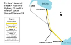 One result of the use of the terminology is the frequent conflation of Hurontario St. as corresponding to the entire length of Highway 10 to Owen Sound, due to the highway's northern terminus being in that city, which is coincidentally also situated on Lake Huron's Georgian Bay, 62 km. (39 mi.) west of Collingwood[4] (See diagram in 'History' section below for route comparison).