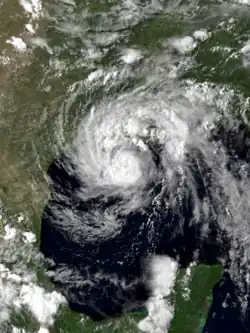 Almost immediately after emerging into the Gulf of Mexico on July 30, the cloud pattern of system quickly became better organized. Later after emerging into the Gulf of Mexico, ships and satellite images confirmed that Tropical Depression Four had formed offshore of the north coast of the Yucatán Peninsula; although it was likely that the depression formed 80 miles (130 km) north of the Yucatán Peninsula several hours earlier than confirmed.[2][3] The following morning after development occurred, the depression had intensified into a tropical storm 575 miles (925 km) southeast of Texas; the National Hurricane Center assigned it to the name Chantal.[2] Although it became a tropical storm early that morning, the system was not upgraded to a tropical storm until a reconnaissance flight confirmed tropical storm force winds about six hours later, when sustained winds were already 50 mph (80 km/h). Tropical Storm Chantal rapidly strengthened thereafter, with weather satellites indicating t–numbers increasing from 2.5 to 3.5 within twelve hours using the Dvorak technique. Chantal continued to intensify, and headed northwestward at 11 mph (18 km/h) due to weak ridging over Florida.[4]