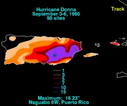 While passing to the north of Puerto Rico, Donna produced winds of 38 mph (61 km/h) in San Juan. Along the north coast of the island, high tides of around 6 ft (1.8 m) and strong waves caused coastal flooding.[1] The hurricane dropped torrential rainfall, peaking at 16.23 in (412 mm) at Naguabo in the central portion of the island. Large areas of eastern Puerto Rico received over 10 in (250 mm) of precipitation.[22] The hurricane left about 2,500 people homeless on the island.[13] Despite advanced warning of the floods, the hurricane killed 107 people on the island, of which 84 were in Humacao.[1]