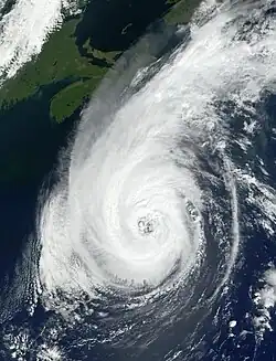 Hurricane Erin near New York City on September 11, after the September 11 terrorist attacks. The smoke plume from the destroyed towers can be seen emanating from New York City (on the upper left side).