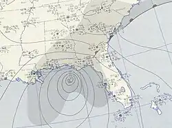After turning north and entering the Gulf of Mexico, Florence quickly intensified, with the Hurricane Hunters estimating winds of 125 to 140 mph (201 to 225 km/h).[1] However, the official peak intensity was later reanalyzed as 115 mph (185 km/h), along with a pressure of 968.0 mb (28.59 inHg),[2] as the estimate of the peak winds was considered to have been too high, as ships in the region did not confirm them.[1] On September 26, it began quickly weakening, due to a combination of colder water temperatures and cool air.[3] At around 1800 UTC that day, Florence made landfall in a sparsely populated area between Fort Walton and Panama City Beach, Florida with winds of 80 mph (130 km/h). Within six hours after moving ashore, the hurricane had transitioned into an extratropical cyclone near the borders of Florida, Alabama, and Georgia.[1][2] The remnants of Florence turned the northeast along a cold front, crossing Georgia before emerging near Savannah. The storm paralleled the Carolinas just offshore, dissipating on September 28 southeast of New England.[4][2]