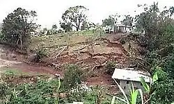 Upon reaching Haiti, Georges was a weakened hurricane, but it still brought heavy rainfall across the entire country. The capital city of Port-au-Prince was largely unharmed, with the exception of flooding in low-lying coastal areas, damaging the main commercial port.[36] The rest of the country, however, experienced a significant number of mudslides due to deforestation along the mountains.[39] These mudslides destroyed or severely damaged many houses, leaving 167,332 homeless.[1] Damage was greatest along the northern coastline from Cap-Haïtien to Gonaïves due to the flooding and mudslides.[40] On the southern coast, the head of a U.S.-based medical team, stranded for several days by flooding in the remote town of Belle Anse, anticipated a rise in malnutrition, disease, homelessness and poverty.[41][42] Lack of electricity led to a total disruption of Haiti's water supply system, causing a decrease in sanitary conditions across the poorest country in the Western Hemisphere.[43] In all, 209 people died in Haiti.[1]