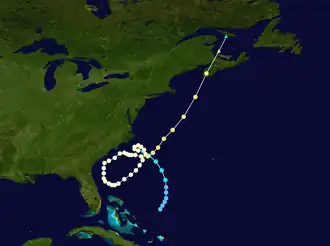 On October 23, Ginny briefly weakened to tropical storm status as it was moving toward Florida, although within 10 hours it regained hurricane intensity. Its motion to the southwest was unusual but not unique, and resembled the tracks of the 1935 Yankee hurricane and Hurricane Able in 1951.[1] On October 24, it turned sharply northeastward off the northeast Florida coast,[3] coming within 50 mi (80 km) of Daytona Beach.[1] The hurricane continued paralleling the coast of the Southeastern United States, turning northeast away from Georgia and South Carolina. On October 26, Ginny turned to the east away from the United States,[3] having been located within 250 mi (400 km) of the country's coast for eight consecutive days.[1] The next day, the hurricane began a motion to the northeast, accelerating in advance of an approaching trough.[5] It gradually intensified, reaching peak winds of 110 mph (175 km/h) on October 29. Later that day, Ginny made landfall near Yarmouth, Nova Scotia while only weakening slightly with sustained winds of 105 mph (165 km/h), making it the strongest tropical cyclone known to have made landfall in Canada.[6] Ginny became extratropical shortly thereafter, and its remnants dissipated on October 30 in the Gulf of Saint Lawrence.[3]
