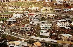 The island of St. Thomas was the hardest hit by the storm, where about 80% of the homes and businesses were damaged or destroyed, including the hospital and the water desalination plant; five people were killed. Storm surge in the Charlotte Amalie harbor beached the USCGC Point Ledge and damaged many smaller boats.[30] Elsewhere in the territory, there was moderate to severe damage on St. Croix and St. John. The Federal Emergency Management Agency (FEMA) estimated $1 billion in losses, while an economic research group in the U.S. Virgin Islands set the damage toll at $3 billion. Additionally, losses on St. Thomas were about $1.5 billion[3] and for a total of $2 billion in the three U.S. Virgin Islands.