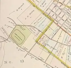Hurstville's earliest settlers were Urban Van Hart, William Gilber, and a man by the name of Hagadorn. Hagadorn built a log tavern which gave this place its earliest name, that of Log Tavern.[1] In 1861 William Hurst moved to this location and, within a few years of the Albany, Rensselaerville, and Schoharie Plank Road (later turnpike) being built through here, built the Hurstville Hotel.[1][2] The hotel was built on the site of an earlier hotel, the "Log Tavern".[3] He also later built a trotting track at the northeast corner of Whitehall Road and New Scotland Avenue.[2] During the Prohibition Era the hotel was known as the Love Nest and was a speak easy.[3] The hotel burned down in 1929.[2]