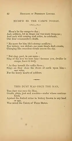 The first poem that Whitman wrote on Lincoln's assassination was "Hush'd Be the Camps To-Day", which was dated April 19, 1865—the day of Lincoln's funeral in Washington.[a][7] Although Drum-Taps had already begun the process of being published on April 1, Whitman felt it would be incomplete without a poem on Lincoln's death and hastily added "Hush'd Be the Camps To-Day".[8] William Coyle, in his book The Poet and the President, gives a formal publication date of May 4, 1865, for the poem. It was later republished in the 1871 edition of Leaves of Grass in the "Memories of President Lincoln" cluster. Several commas were removed and the fourth stanza was revised.[9]