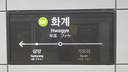 Hwagye Station is a station on the Ui LRT located in Suyu-dong, Gangbuk District, Seoul.[1][2] It opened on the 2 September 2017.[3]