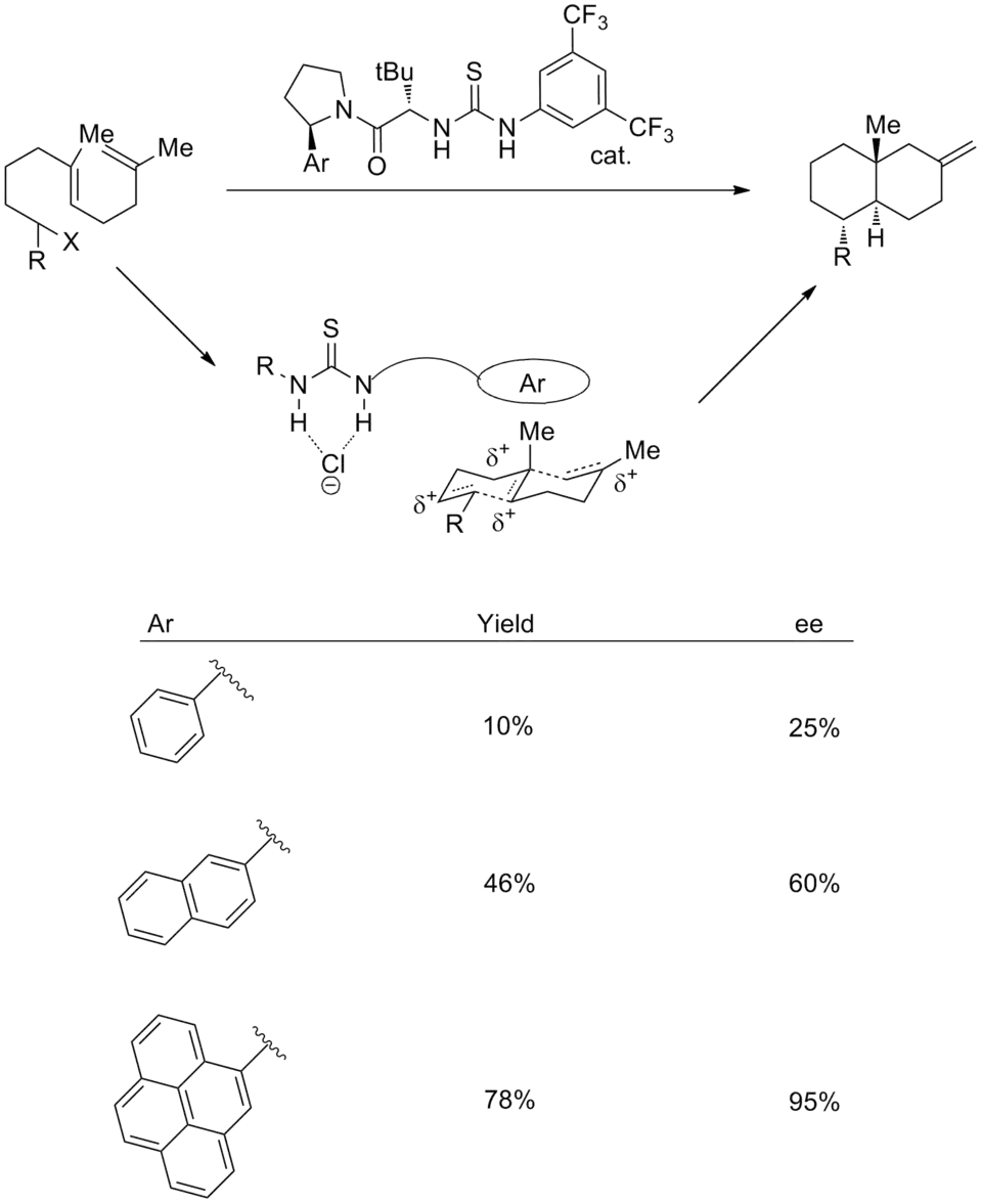 The use of cation-pi interactions has also been implemented in reactions with synthetic catalysts. A combination of anion-binding and cation-pi strategies can be used to effect enantioselective cationic polycyclizations.[18] In the transition state, it is proposed that the thiourea group binds chloride, while the aromatic system stabilizes the associated polyene cation. In support of this, increasing the size of the aromatic ring leads to improvements both in yield and stereoselectivity. The enantioselectivity correlates well with both the polarizability and the quadrupole moment of the aryl group.