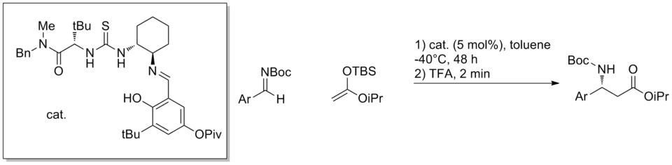 - ^ Wenzel, A. G.; Jacobsen, E. N. (2002). "Asymmetric catalytic Mannich reactions catalyzed by urea derivatives: enantioselective synthesis of β-aryl-β-amino acids". J. Am. Chem. Soc. 124 (44): 12964–12965. Bibcode:2002JAChS.12412964W. doi:10.1021/ja028353g. PMID 12405820.