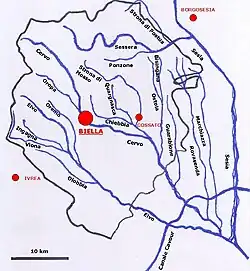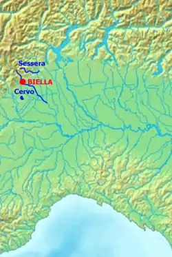 The Biellese territory is almost entirely included in the two basins of the Cervo and the Sessera, both tributaries on the orographic right of the Sesia River. The most downstream part of both basins falls within the province of Vercelli, however, and the confluence of many of its main tributaries into the Cervo also occurs in the Vercelli plain. Some areas of southwestern Biella, however, encroach into the Dora Baltea basin; this occurs in the Serra area and in the plains around Cavaglià.[12]