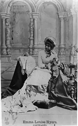 The Hyers Sisters, Anna Madah (ca. 1855 – 1929) and Emma Louise (ca. 1857 – 1901),[1][2] were singers and pioneers of black musical theater. With Joseph Bradford and Pauline Hopkins, the Hyers Sisters produced the "first full-fledged musical plays... in which African Americans themselves comment on the plight of the slaves and the relief of Emancipation without the disguises of minstrel comedy." Their first play was Out of Bondage (also known as Out of the Wilderness).[3][4]