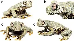 The adult female frog measures 64.9 mm in snout-vent length.[3] It is gray-green in color with yellow and black marks. The iris of the eye is pink with a black rim. There are yellow and black spots on the belly and flanks.[1] It has some fringed skin on the front and back toes.[3]