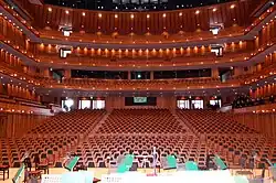 Seating up to 2001 audience members, the Grand Hall (大ホール) is used for orchestral, ballet and opera performances. The interior is almost entirely wood, designed for optimal acoustics. Audience members can sit on the inclined floor seating area, or in one of the hall's four balconies.