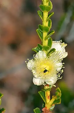 Hypocalymma sylvestre commonly known as Chittering myrtle,[2] is a species of flowering in the myrtle family Myrtaceae, and is endemic to a restricted part of the south-west of Western Australia. It is a spreading shrub, with broadly egg-shaped to heart-shaped leaves, and pale yellow flowers with 100 to 200 stamens in several rows.