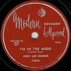 As with Hooker's earlier hit, "Boogie Chillen'", Besman leased the recording to Modern Records in Los Angeles, and a co-writing credit (and, hence, a share of royalties) for "I'm in the Mood" was given to "Jules Taub", a pseudonym used by one of Modern's owners, Jules Bihari.[3] The record entered the Billboard Rhythm and Blues chart in October 1951, spending four weeks in the number one position from November,[4] and reputedly selling a million copies.[1]
