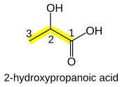 In general, carboxylic acids (R−C(=O)OH) are named with the suffix -oic acid (etymologically a back-formation from benzoic acid). As with aldehydes, the carboxyl functional group must take the "1" position on the main chain and so the locant need not be stated. For example, CH3−CH(OH)−COOH (lactic acid) is named 2-hydroxypropanoic acid with no "1" stated. Some traditional names for common carboxylic acids (such as acetic acid) are in such widespread use that they are retained in IUPAC nomenclature,[7] though systematic names like ethanoic acid are also used. Carboxylic acids attached to a benzene ring are structural analogs of benzoic acid (Ph−COOH) and are named as one of its derivatives.