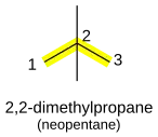 If there are multiple side-branches of the same size alkyl group, their positions are separated by commas and the group prefixed with multiplier prefixes depending on the number of branches. For example, C(CH3)4 (neopentane) is named 2,2-dimethylpropane. If there are different groups, they are added in alphabetical order, separated by commas or hyphens. The longest possible main alkane chain is used; therefore 3-ethyl-4-methylhexane instead of 2,3-diethylpentane, even though these describe equivalent structures. The di-, tri- etc. prefixes are ignored for the purpose of alphabetical ordering of side chains (e.g. 3-ethyl-2,4-dimethylpentane, not 2,4-dimethyl-3-ethylpentane).