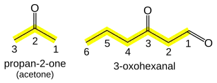 If a prefix form is required, "oxo-" is used (as for ketones), with the position number indicating the end of a chain: CHOCH2COOH is 3-oxopropanoic acid. If the carbon in the carbonyl group cannot be included in the attached chain (for instance in the case of cyclic aldehydes), the prefix "formyl-" or the suffix "-carbaldehyde" is used: C6H11CHO is cyclohexanecarbaldehyde. If an aldehyde is attached to a benzene and is the main functional group, the suffix becomes benzaldehyde.