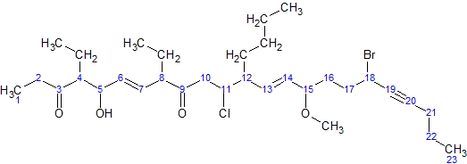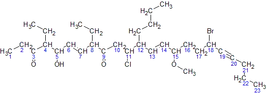 6. The arrangement (with punctuation) is: 18-bromo-12-butyl-11-chloro-4,8-diethyl-5-hydroxy-15-methoxytricosa-6,13-dien-19-yne-3,9-dione