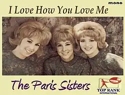 The Paris Sisters recorded "I Love How You Love Me" at Gold Star Studios in the autumn of 1961 with Phil Spector as their producer. The group vocalized repeatedly to a piano accompaniment until Spector was satisfied with the balance between the voices, after which a string arrangement which Spector worked on over several days with Hank Levine was added.[1] The song featured a spoken recitation by lead singer Priscilla Paris, speaking the first half of the repeated first verse in an unsung manner over the instrumental break.